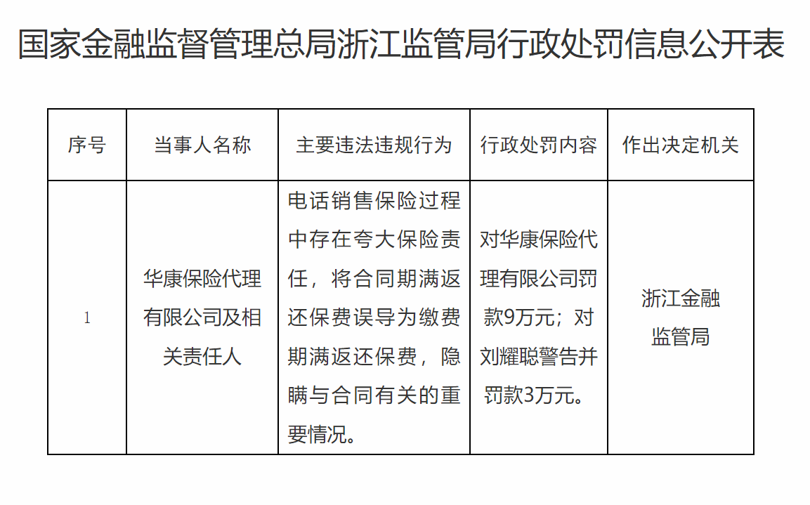 7月24日,国家金融监督管理总局浙江监管局行政处罚信息公开表显示,华康保险代理有限公司,电话销售保险过程中存在夸大保险责任,将合同期满返还保费误导为缴费期满返还保费,隐瞒与合同有关的重要情况,被罚款9万元;相关责任人刘耀聪被警告并罚款3万元。