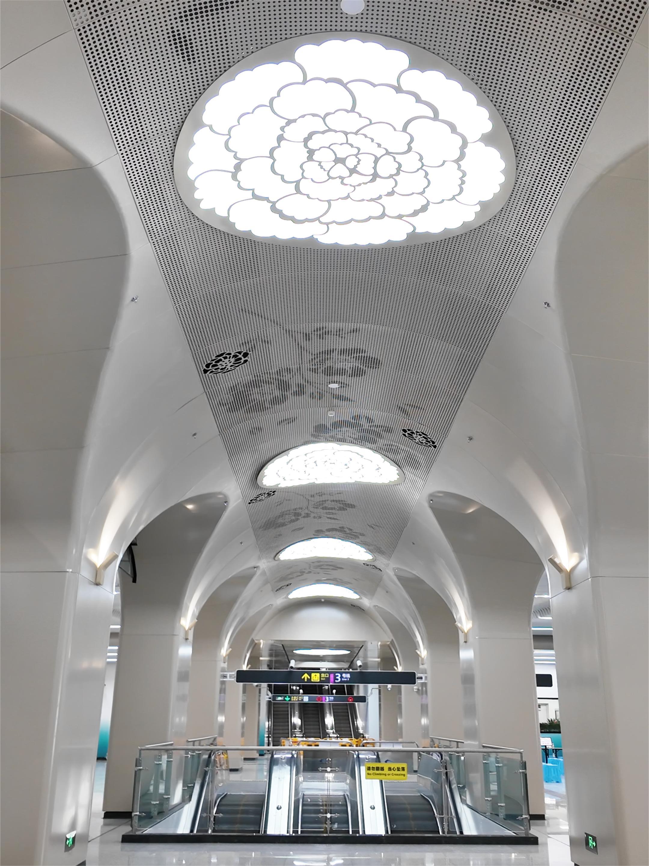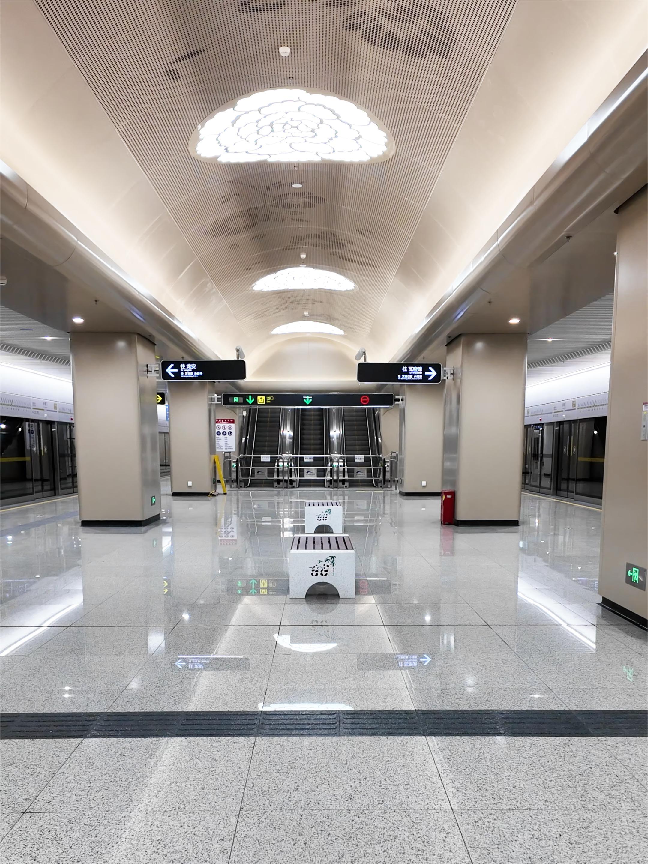 步入新南门站,连续的拱形结构唤起对古城门的记忆;天花板上芙蓉造型花灯,宛若繁星点点;两侧墙面青蓝渐变如锦江波光,整体氛围简约现代而不失古典韵味。